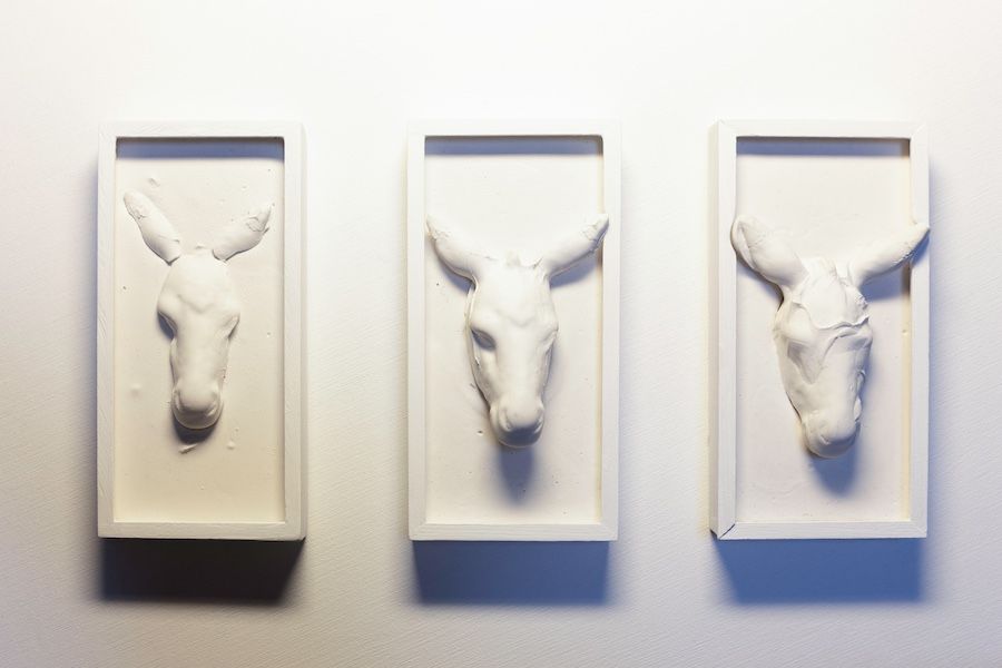 unreadymades* is a series of handmade deliberately faulty plaster castings of artefacts, mounted in wooden frames.